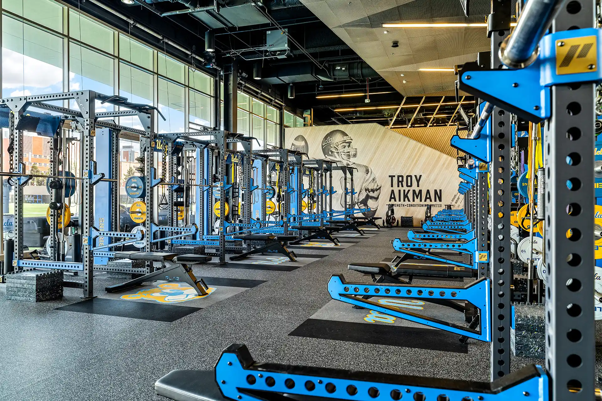 PLAE partnered with UCLA to deliver a complete facility renovation featuring performance flooring, modular rack systems, and customized equipment optimized for football training. Illuminated branding and curated historical details provide visual impact while supporting team culture. The result is a modern collegiate strength center that blends UCLA's storied tradition with elite performance infrastructure.